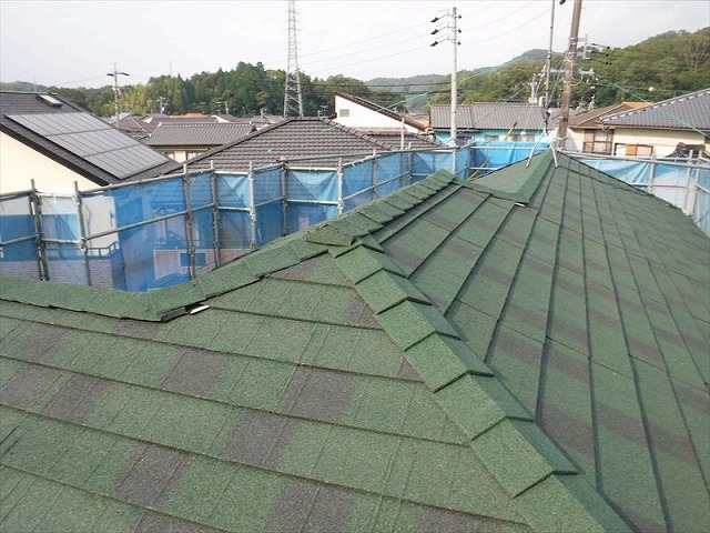 多治見市の戸建住宅でスレート屋根を金属屋根材のディプロマットを使って屋根カバー工事を行う事例の続きです。>>多治見市で劣化したスレート屋根を屋根カバー工事で補修するため棟の撤去、破損部分の補修>>多治見市で屋根カバー工事のためスレート屋根の端部に役物を付け…